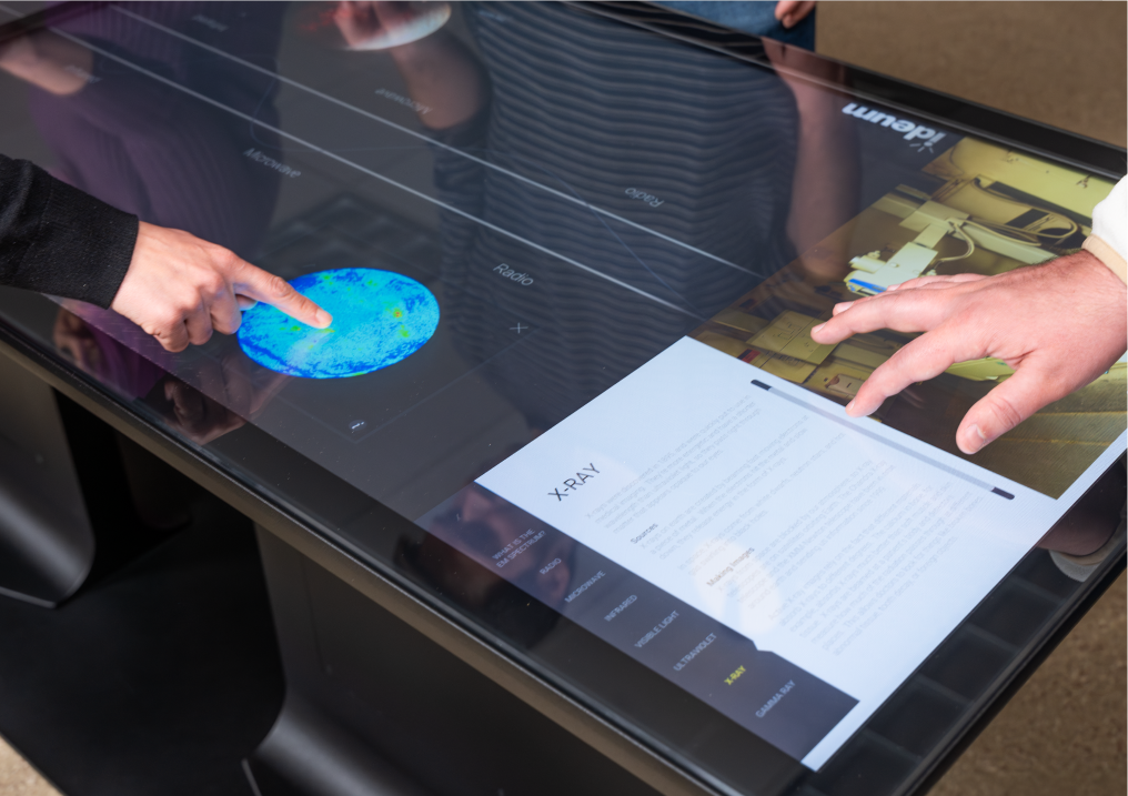 EM Spectrum is designed for use on the Ideum Pano ultra-wide touch screen table. The Pano is nearly 90 inches long, and the contiguous dual UHD displays provide a unique 7680 x 2160 pixel ultra-wide multitouch surface. Built with Ideum’s patented aircraft-grade aluminum frame and finished with a durable powder coat, the Pano includes a lockable enclosure and is designed for multi-person use in demanding public environments.